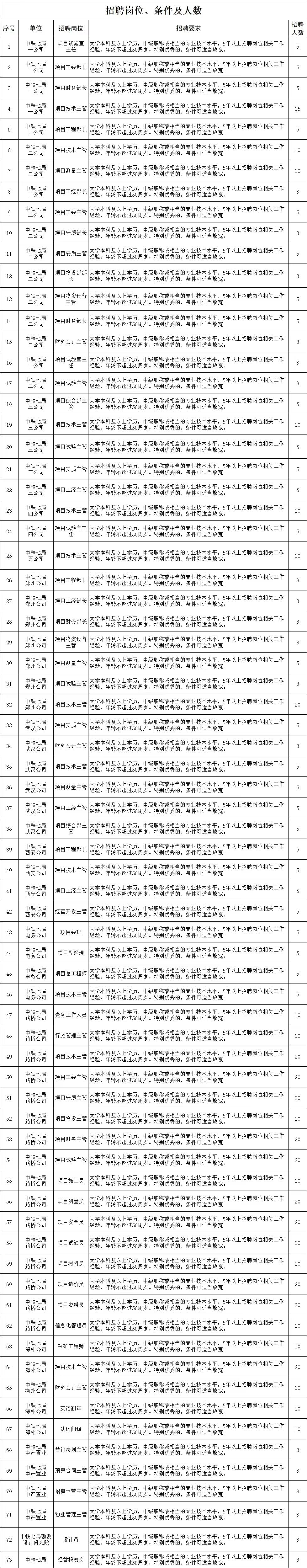 因生產(chǎn)經(jīng)營及發(fā)展需要,中鐵七局及所屬各單位現(xiàn)面向社會公開招聘經(jīng)營管理和專業(yè)技術(shù)人才。具體事宜如下: